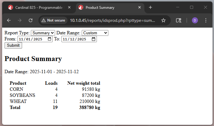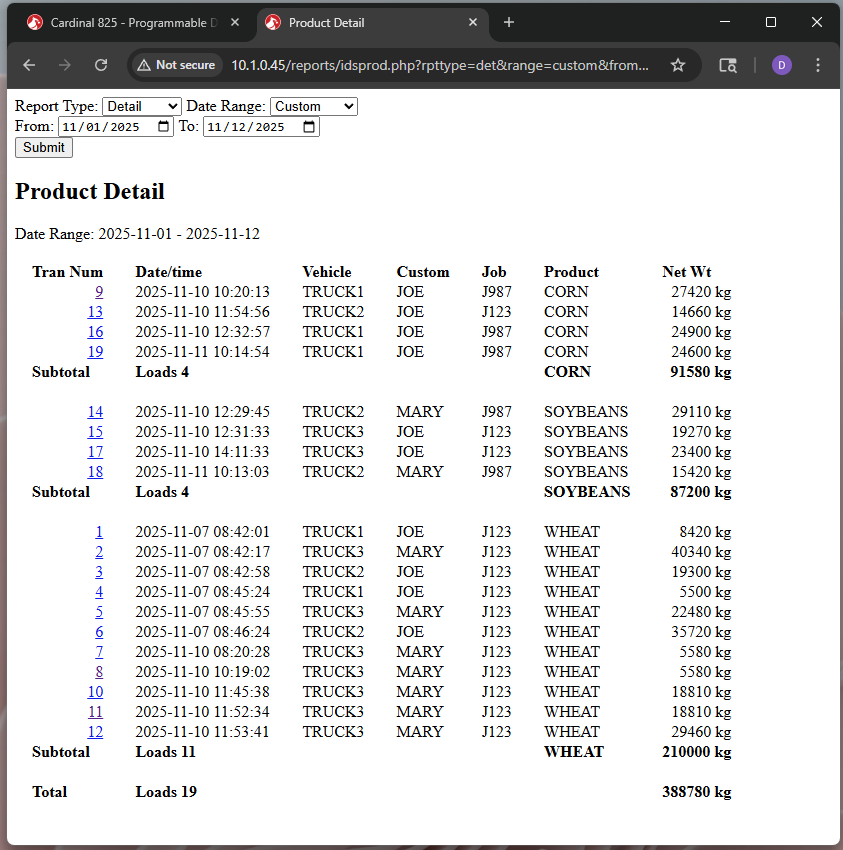 <?php session_start(); if(!isset($_SESSION['user']) || empty($_SESSION['user'])) { header("location: ../login.php"); exit(); } $type = $_GET['rpttype']; if(!$type) { $type = "sum"; } ?> <!DOCTYPE html> <html lang="en"> <script> function toggleInputs() { const selectElement = document.getElementById("rangeSelect"); const selectedValue = selectElement.value; const customInputs = document.getElementById("customInputs"); // Hide all input containers initially customInputs.style.display = "none"; // Show the relevant input container based on selection if (selectedValue === "custom") { customInputs.style.display = "block"; } } </script> <head> <?php if($type == 'det') { echo '<title>Product Detail</title>'; } else { echo '<title>Product Summary</title>'; } ?> <style type="text/css" media="screen"> #tblSum { tr td,th { text-align: right; padding: 0 15px; } td:nth-child(1) { text-align: left; } th:nth-child(1) { text-align: left; } } #tblDet { tr td,th { text-align: left; padding: 0 15px; } td:nth-child(1) { text-align: right; } td:nth-child(7) { text-align: right; } th:nth-child(4) { text-align: right; } } </style> </head> <body> <?php $ranges = [ ['id' => 'today', 'name' => 'Today'], ['id' => 'tweek', 'name' => 'This week'], ['id' => 'tmonth', 'name' => 'This month'], ['id' => 'tyear', 'name' => 'This year'], ['id' => 'lweek', 'name' => 'Last week'], ['id' => 'lmonth', 'name' => 'Last month'], ['id' => 'lyear', 'name' => 'Last year'], ['id' => 'custom', 'name' => 'Custom'], ]; $types = [ ['id' => 'sum', 'name' => 'Summary'], ['id' => 'det', 'name' => 'Detail'], ]; $jsonFile = '/mnt/nand/apps/ids/db.json'; $jsonContent = file_get_contents($jsonFile); $data = json_decode($jsonContent, true); if (!$data) { echo "ID Storage database not configured"; } else { if ($data['dbtype'] != 'mysql') { echo "ID Storage database type must by MySQL for reporting"; } else { $range = $_GET['range']; if(!$range) { $range = "today"; } echo '<form action="/reports/idsprod.php" method="GET">'; echo '<label>Report Type: </label><select name="rpttype" id="typeSelect">'; foreach ($types as $t): echo '<option value="' . $t['id'] . '"'; if($t['id'] == $type) { echo " selected"; } echo '>' . $t['name']; echo '</option>'; endforeach; echo '</select>'; echo '<label> Date Range: </label><select name="range" id="rangeSelect" onchange="toggleInputs()">'; foreach ($ranges as $r): echo '<option value="' . $r['id'] . '"'; if($r['id'] == $range) { echo " selected"; } echo '>' . $r['name']; echo '</option>'; endforeach; echo '</select>'; $dateFrom = $_GET['from']; $dateTo = $_GET['to']; if($range != "custom") { echo '<div id="customInputs" style="display: none;">'; } else { echo '<div id="customInputs">'; } echo '<label for="from">From: </label>'; echo '<input type="date" name="from" id="from" value="' . $dateFrom . '">'; echo '<label for="to"> To: </label>'; echo '<input type="date" name="to" id="to" value="' . $dateTo . '">'; echo '</div>'; echo ' '; echo '<input type="submit" value="Submit">'; echo '</form>'; $tzpath = realpath("/etc/localtime"); if(substr($tzpath, 0, 20) == '/usr/share/zoneinfo/') { $tz = substr($tzpath, 20); date_default_timezone_set($tz); } // echo "Date/time " . date('Y-m-d H:i:s'); $conn = mysqli_connect($data['server'], $data['user'], $data['passw'], $data['database']); if(mysqli_connect_error()) { echo 'Server ' . $data['server'] . ' Connection error: ' . mysqli_connect_error(); } else { //echo "range " . $range; $units = ""; $dateTo = ""; switch($range) { case "today": $dateFrom = date('Y-m-d'); $dateTo = date('Y-m-d'); break; case "tweek": $dayOfWeek = date('w'); $d = new DateTime(); if($dayOfWeek != 0) { $d->modify('-' . strval($dayOfWeek) . ' days'); } $dateFrom = date('Y-m-d', $d->GetTimestamp()); break; case "tmonth": $dateFrom = date('Y-m') . '-01'; break; case "tyear": $dateFrom = date('Y') . '-01-01'; break; case "lweek": $dayOfWeek = date('w'); $d = new DateTime(); $d->modify('-' . strval($dayOfWeek + 7) . ' days'); $dateFrom = date('Y-m-d', $d->GetTimestamp()); $d->modify('+ 6 days'); $dateTo = date('Y-m-d', $d->GetTimestamp()); //echo 'Day of week ' . $dayOfWeek . ' Last week ' . $dateFrom . ' - ' . $dateTo . '<br>'; break; case "lmonth": $d1 = strtotime("-1 months"); $dateFrom = date("Y-m", $d1) . "-01"; $dateTo = date("Y-m-t", $d1); break; case "lyear": $d1 = strtotime("-1 years"); $dateFrom = date("Y", $d1) . "-01-01"; $dateTo = date("Y", $d1) . "-12-31"; break; case "custom": $dateFrom = $_GET['from']; $dateTo = $_GET['to']; break; } //echo "where ". $where; if($dateFrom == $dateTo) { $where = "WHERE datetm >= '" . $dateFrom . " 00:00:00' AND datetm <= '". $dateTo . " 23:59:59'"; } else { if($dateTo != "") { $where = "WHERE datetm >= '" . $dateFrom . " 00:00:00' AND datetm <= '". $dateTo . " 23:59:59'"; } else { $where = "WHERE datetm >= '" . $dateFrom . " 00:00:00'"; } } if($type == "sum") { echo "<h2>Product Summary</h2>"; } else { echo "<h2>Product Detail</h2>"; } if($dateFrom == $dateTo) { echo "Date: " . $dateFrom; } else { echo "Date Range: " . $dateFrom . " - "; if($dateTo != "") { echo $dateTo; } } echo "<br><br>"; if($type == "sum") { $sql = 'SELECT prod, units, COUNT(*) AS ProdCount, SUM(net) AS NetTotal FROM trans ' . $where . ' GROUP BY prod;'; $result = $conn->query($sql); if(!$result) { echo "query error "; } if($result->num_rows > 0) { $totCount = 0; $totNet = 0; echo '<table id="tblSum"><tr><th>Product</th><th>Loads</th><th>Net weight total</th></tr>'; while($row = $result->fetch_assoc()) { $prod = $row['prod']; $units = $row['units']; $count = $row['ProdCount']; $netTotal = $row['NetTotal']; echo '<tr><td>' . $prod . '</td><td>' . $count . '</td><td>' . $netTotal .' ' . $units . '</td></tr>'; $totCount += $count; $totNet += $netTotal; } echo '<tr><th>Total</th><th>' . $totCount . '</th><th>' . $totNet .' ' . $units . '</th></tr>'; echo '</table>'; } } else { $sql = 'SELECT * FROM trans ' . $where . ' ORDER BY prod,datetm;'; $result = $conn->query($sql); if(!$result) { echo